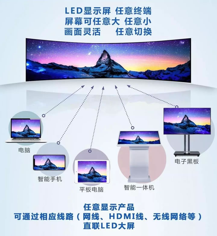 任意終端可通過相應線路(網(wǎng)絡、HDMI線、無線網(wǎng)絡等)直連LED大屏,實現(xiàn)小屏大屏同步互聯(lián),通過小屏控制大屏,釋放更多靈活性與操作性。