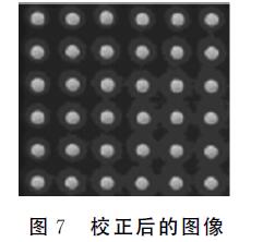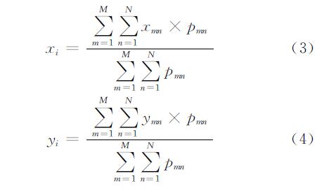 式中(xi,yi)為燈點區(qū)域的重心坐標,也就是相對應(yīng)LED燈點的中心位置坐標;燈點區(qū)域的大小為M×N,M、N分別為燈點區(qū)域?qū)挾群透叨确较蛏系南袼貍€數(shù);(xmn,ymn)為燈點區(qū)域內(nèi)圖像像素(m,n)的坐標,m、n分別為該圖像像素在該燈點區(qū)域內(nèi)所處的行和列;pmn為燈點區(qū)域內(nèi)該圖像像素(m,n)的二值化后的值。如圖2(c)所示,該方法能夠確定各個LED燈點的位置,并且由于使用了閾值分割的方法,能有效地避免燈點之間的相互干擾,使計算出的燈點的位置更加精確。