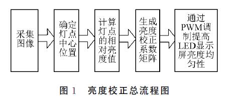 本文運用數(shù)字圖像處理技術(shù)對顯示屏上每個燈點的相對亮度進行檢測和提取,計算出各個燈點的校正系數(shù)矩陣,并運用脈沖寬度調(diào)制(PWM)方法調(diào)節(jié)相應(yīng)燈點的亮度,從而提高全彩LED顯示屏的亮度均勻性。圖1為算法的總流程圖。