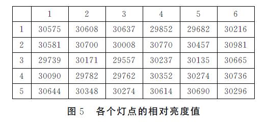 (2)以每個燈點的中心位置為中心,以操作距離為半徑作圓,如圖4所示,提取該圓形區(qū)域內(nèi)的各個像素的灰度值進行求和。此灰度值的和即為該燈點的相對亮度值。在全部亮度提取完后保存為亮度數(shù)據(jù)文件,如圖5所示。