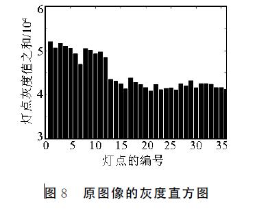 在確定燈點的具體位置之前,先要對采集到的圖像進行灰度分布的統(tǒng)計,在所獲取的感光圖像中,由于燈點一般是由矩陣的方式排列,且燈點區(qū)域與背景區(qū)域的灰度值存在明顯的差異,有時還會產(chǎn)生環(huán)繞光的現(xiàn)象,因此需對圖像進行二值化處理。本文采用了大津法(OTSU)確定閾值,該方法計算簡便,且在一定條件下不受圖像對比度和亮度變化的影響,所以應(yīng)用非常廣泛。其原理如下:
