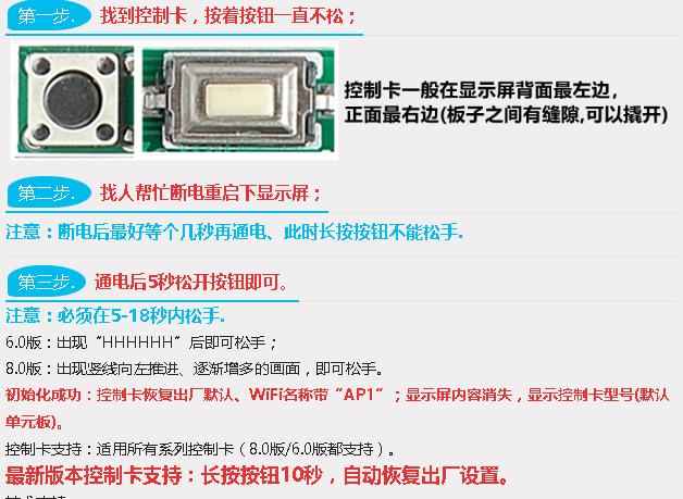 近來led顯示屏采用了瑞合信控制卡的都需要密碼,只有部改過顯示屏內(nèi)容的手機(jī)才能操作。如果找不到先前操作的人,只能讓控制卡恢復(fù)出廠設(shè)置,初始化控制卡密碼。然后再修改密碼。下面介紹操作的兩種方法: